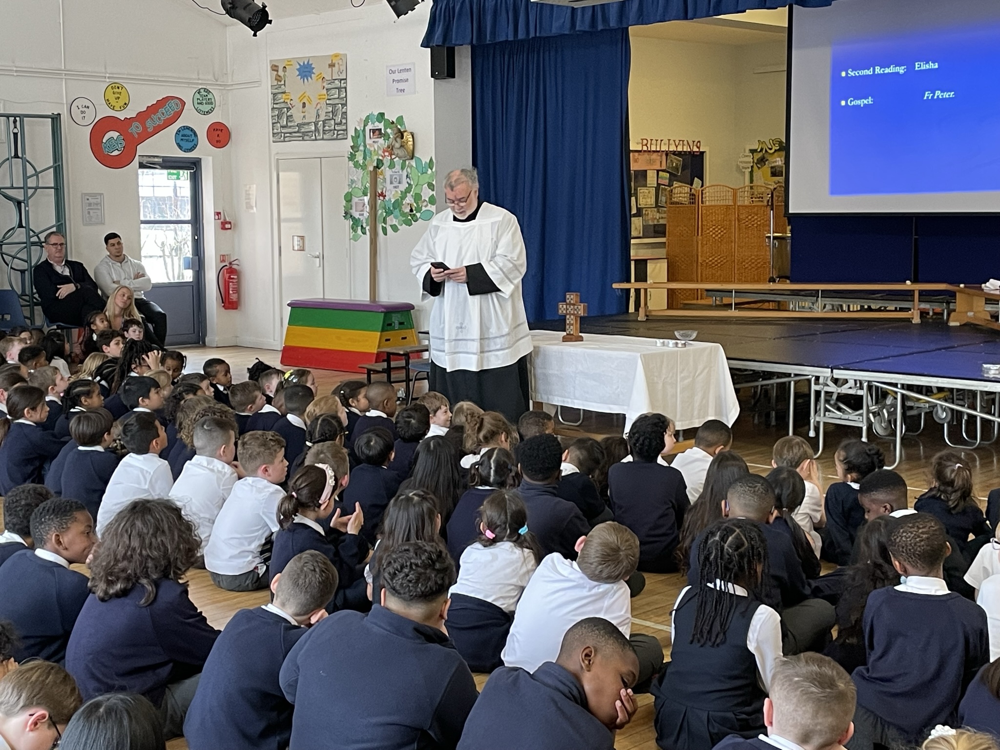 Each year Year 5 pupils present the Passion of Our Lord. They begin with Jesus’ triumphant entry into Jerusalem, his Last Supper, his arrest, Crucifixion, burial and his Resurrection. The story is told with prayers and songs.